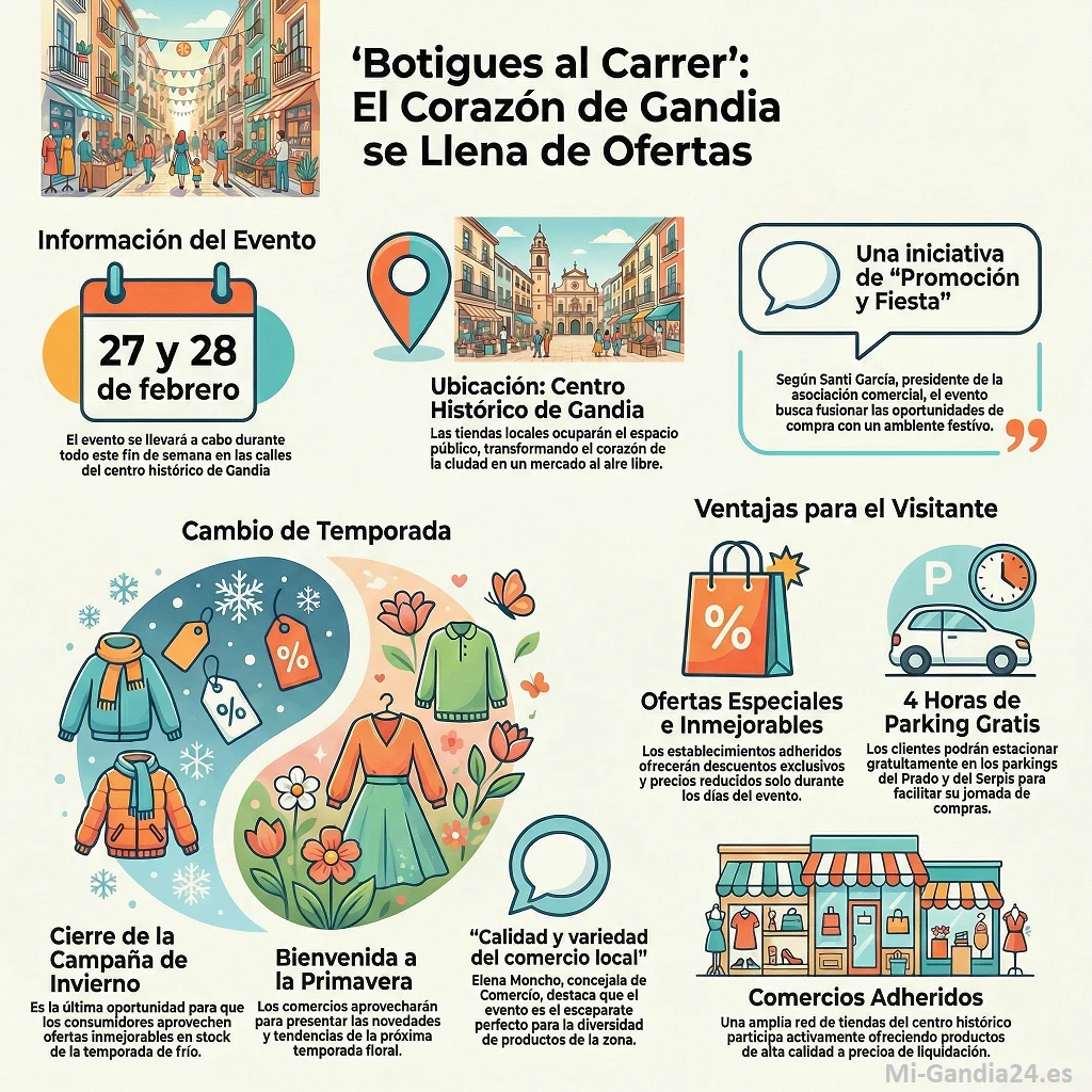 Este fin de semana, las calles de Gandia se convertirán en un vibrante centro comercial al aire libre con la celebración de una nueva edición de ‘Botigues al Carrer’. Durante este viernes 27 y sábado 28 de febrero, los establecimientos del Centro Histórico sacarán sus productos a la calle, ofreciendo a vecinos y visitantes la oportunidad perfecta para cazar las últimas gangas de la temporada de invierno y descubrir los adelantos de la primavera. Esta iniciativa, consolidada en el calendario local, no solo busca dinamizar la economía, sino también reivindicar el valor del comercio de proximidad frente a las grandes superficies.