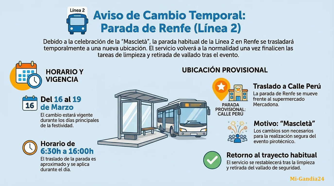 Si vas a coger el autobús por las mañanas, este es el cambio más importante: debido al montaje y disparo de la mascletá en la estación de Renfe, la parada habitual se traslada a la Calle Perú (frente a Mercadona). Esta modificación provisional está activa desde el domingo 15 hasta el jueves 19 de marzo, en horario aproximado de 6:30h a 16:00h. Una vez finalicen los trabajos de limpieza diarios, el autobús volverá a su parada normal.