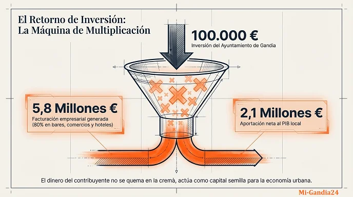El dato más revelador para los escépticos es el retorno de la inversión pública (ROI). Por cada 100.000 euros que el Ayuntamiento de Gandia destina a la festividad, se genera una facturación empresarial de 5,8 millones de euros y una aportación al PIB local de 2,1 millones. Es decir, el dinero del contribuyente no se «quema» en la cremà, sino que se multiplica exponencialmente en los bares, comercios y hoteles de la ciudad, que concentran el 80% del valor añadido de estos días.