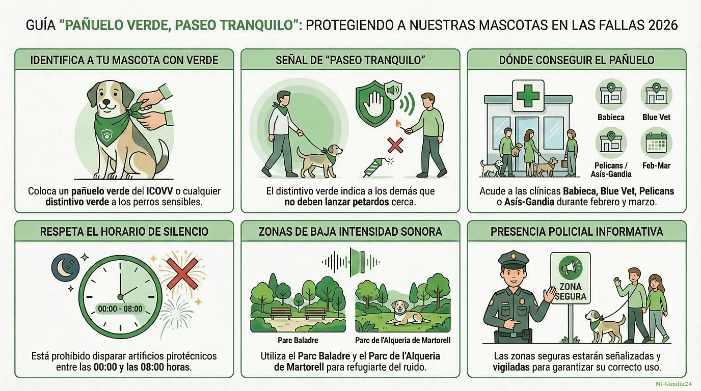 El Ayuntamiento de Gandia se suma a la campaña del «Pañuelo Verde» para proteger a los perros del ruido durante estas Fallas 2026. Sin embargo, la iniciativa levanta una pregunta ciudadana inevitable: ¿por qué los afectados deben «marcarse» para estar seguros, en lugar de habilitar zonas específicas y alejadas para el lanzamiento de pirotecnia? Analizamos las luces y sombras de esta propuesta.
